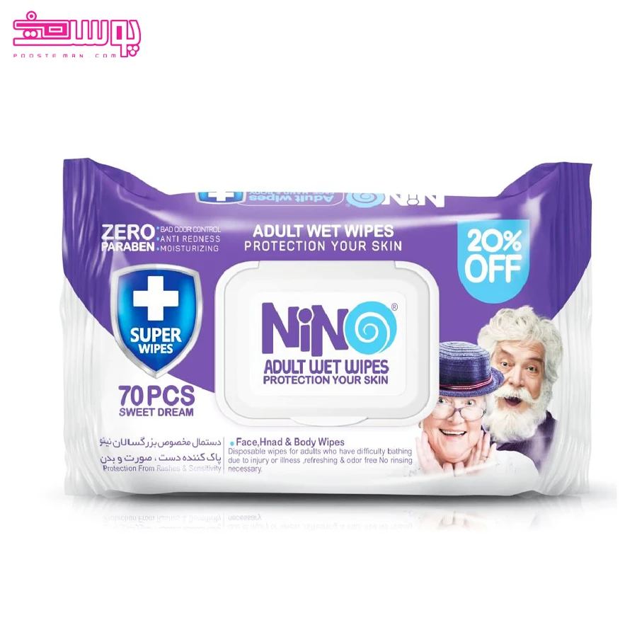 دستمال مرطوب دست و صورت بزرگسالان درب دار نینو ۷۰ برگی