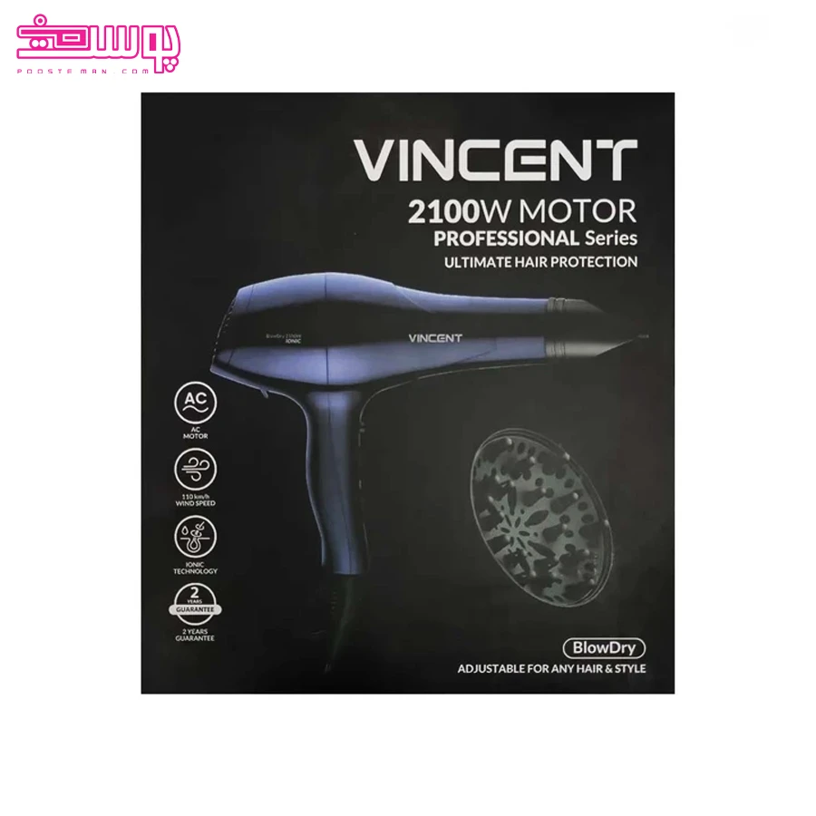سشوار وینسنت مدل HD5321 با توان مصرفی 2100 وات و موتور AC قدرتمند با پرتاب باد تا 100 کیلومتر بر ساعت، گزینه ای ایده آل برای خشک کردن سریع و موثر انواع مو است.