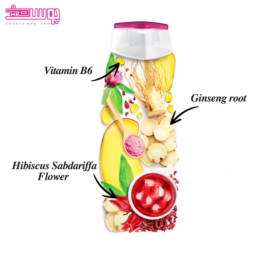 • حاوی چای سبز، ریشه جینسینگ، ویتامین‌ های B5 و B6