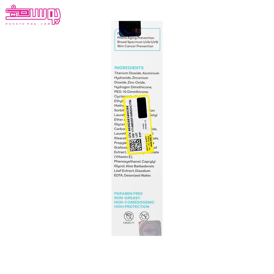 تیتانیوم دی اکساید، آلومینیوم هیدروکساید، زیرکونیوم دی اکساید، زینک اکساید، هیدروژن دایمتیکون، پی ای جی-۱۰ دایمتیکون، سیکلوپنتاسیلوکسان، اتیل هگزیل متوکسی سینامات، پی ای جی-۷ گلیسیریل کوکوات، سوربیتان اولئات، کربومر، تری پی پی جی-۳ میریستیل اتر سیترات، سوربیتان لورات، پلی آکریلامید، لورت-۷، اوره، تالک، گلیسیریل استئارات، پی ای جی-۱۰۰ استئارات، پروپیلن گلایکول، عصاره آلوئه ورا، اسانس مجاز آرایشی و بهداشتی، دی سدیم ا د ت ا، آب دیونیزه.