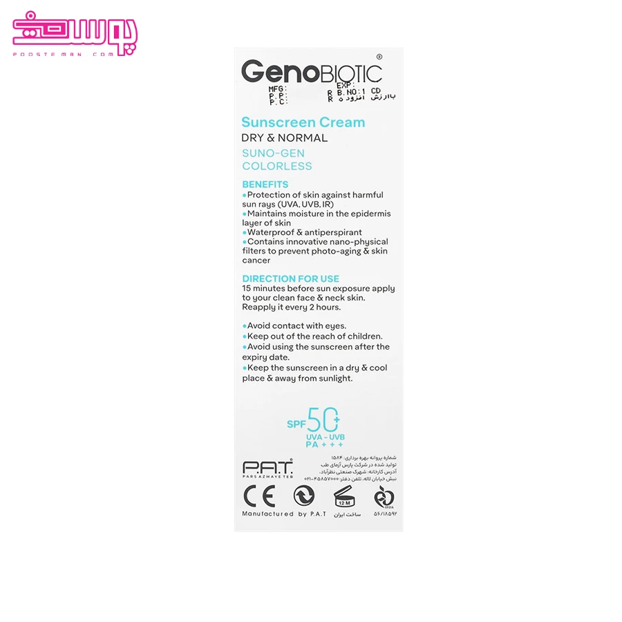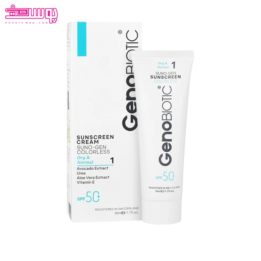 ضد آفتاب بی رنگ پوست خشک ژنوبایوتیک SPF 50 حجم 50ml