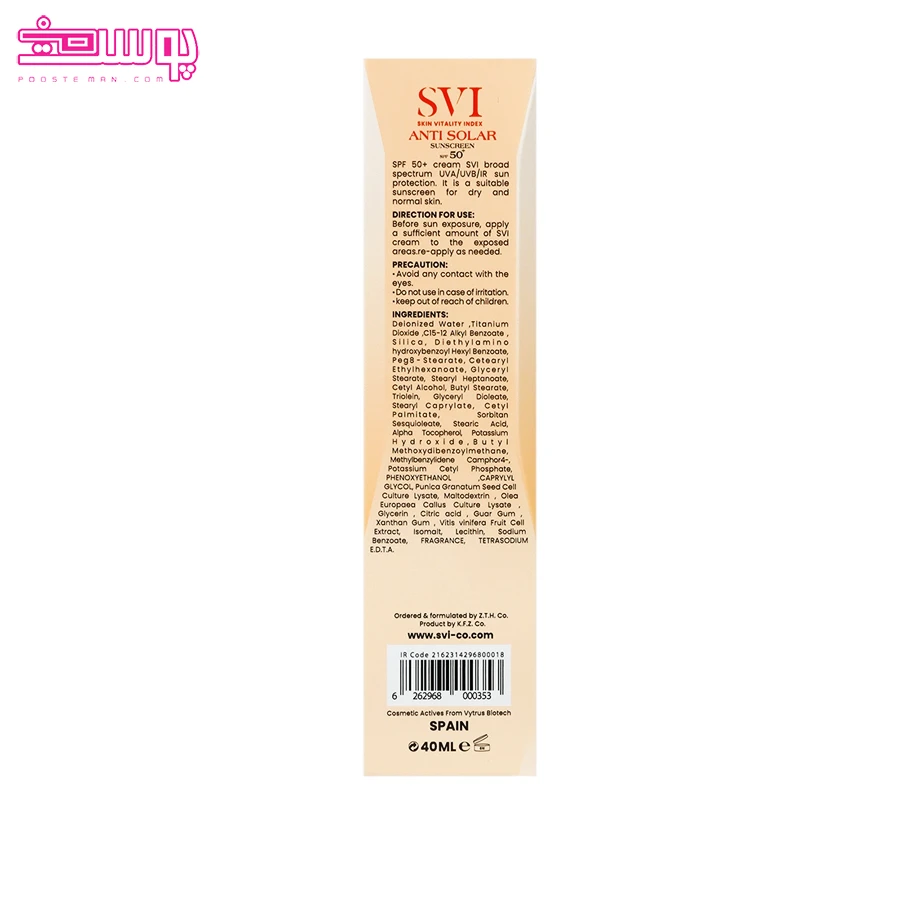 فرمولاسیونکرم ضد آفتاب بی رنگ پوست خشک اس وی آی در برابر آب و تعریق مقاوم بوده و برای استفاده روزمره طراحی شده است. بافت سبک و بی‌ رنگ این محصول باعث می‌ شود تا به‌ راحتی جذب شده و گزینه‌ ای ایده‌ آل به عنوان زیرساز آرایش باشد. ضد آفتاب پوست خشک اس وی آی برای استفاده روزانه بزرگسالان مناسب است و به حفظ رطوبت، آرامش و محافظت همه‌ جانبه پوست در طول روز می پردازد.