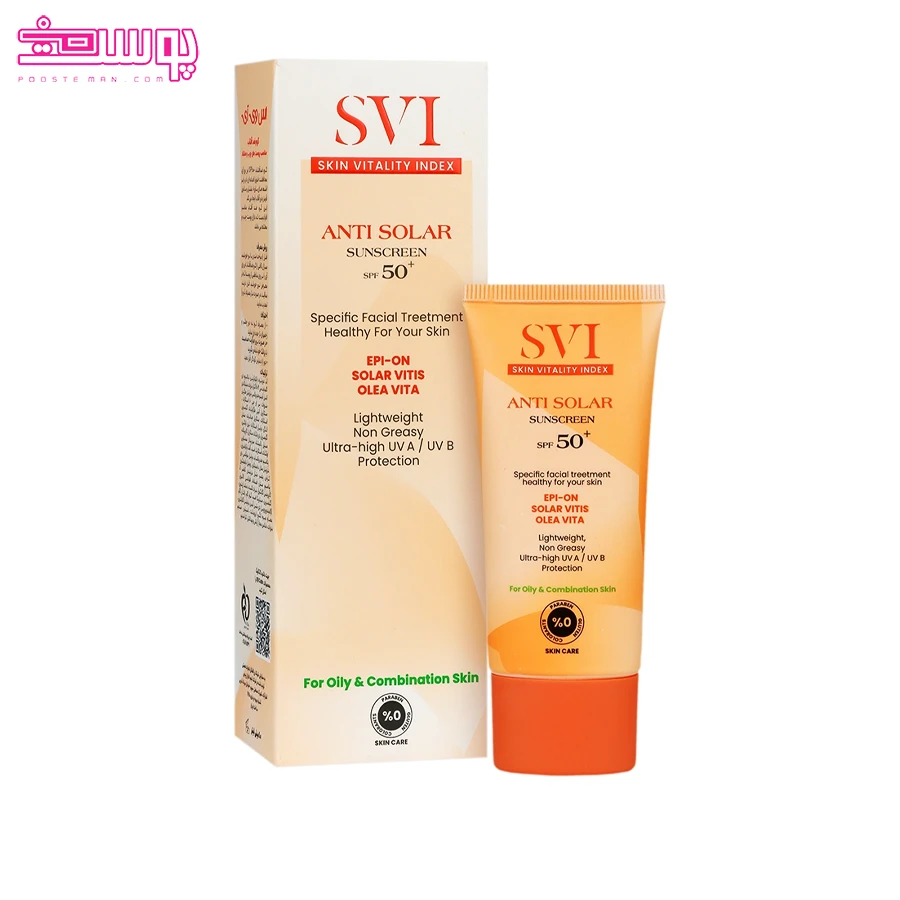 این کرم با فیلترهای محافظتی گسترده از پوست در برابر اشعه های UVA و UVB و حتی اشعه مادون قرمز محافظت می کند و از ایجاد آسیب های ناشی از نور خورشید جلوگیری می نماید. بافت سبک و جذب سریع کرم ضد آفتاب بی رنگ پوست چرب SPF50 اس وی آی، بدون ایجاد حس سنگینی یا چربی، کنترل ترشح سبوم و کاهش برق اضافی پوست را ممکن خواهد ساخت. همچنین این محصول دارای کمپلکس های مرطوب کننده است که از خشکی و التهاب پوست جلوگیری نموده و حس راحتی و نرمی به پوست می دهند.